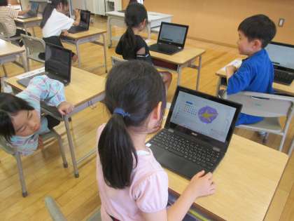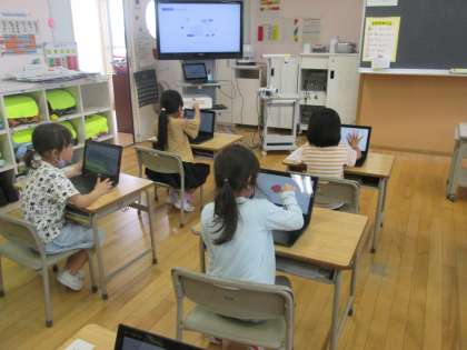今日は、お絵かきのアプリを使って絵をかいてみました。すきな色をつかって、キリンやぞう、にじなどの絵をかきました。子供たちは楽しそうに活動しました。