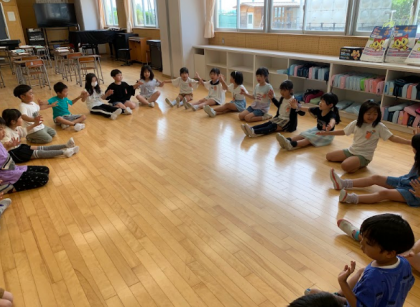 2拍子の曲「はしの上で」のリズム打ちが上達したので、ペアからグループ、最後には全員で輪になってリズム打ちをしました。足も動かしている子が何人もいて、全身でリズムにのっています。