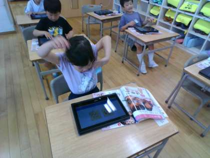 次に、国語の「はなのみち」のQRコードを込み取りました。音読する声が聞こえてきて、子供たちは、驚いたりびっくりしたりしながら楽しんでいました。