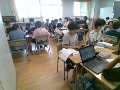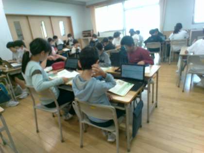 道徳科では、小グループで意見を交換したり、端末に書かれた友達の意見を参考にしたりして、考えを深めています。