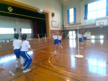体育科「つないでアタック!ゲキアツバレーボール」では、4年生で学習したキャッチバレーから難易度を少し高めてゲームをしました。得点の入った際には、チーム全員で喜んだり、相手の動きに対して励ましの声をかけたりする姿が見られました。