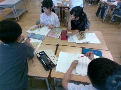 スイミーの学習で、スイミーや小さな魚の仲間たちの言動についてグループで話し合いました。