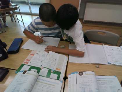 分数のわり算では、小数や整数、分数が混ざった計算でも分数にすると計算できることを学習しました。自然と教え合いがうまれています。