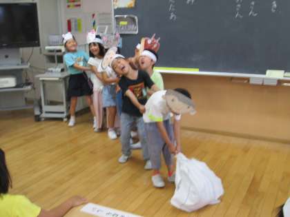 国語で学習した「大きなかぶ」の劇をグループごとにしました。おじいさん役やおばあさん役など、自分たちで役割分担をしました。大きな声で台詞をいったり、動作をつけたりして楽しみながら演じていました。