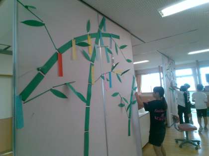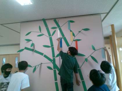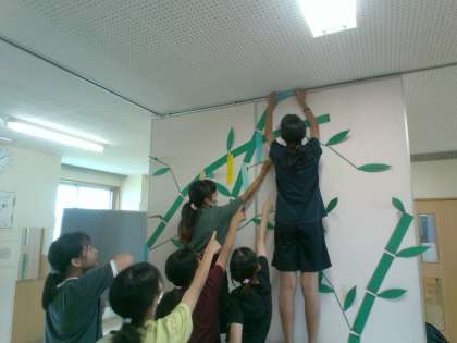 外国語の時間に、七夕の願いを英語で書きました。「I want〜.」「I wish 〜.」を用いて書いた短冊を飾り付けました。
