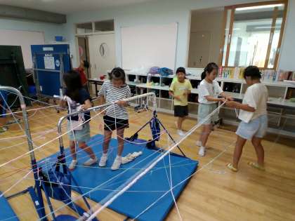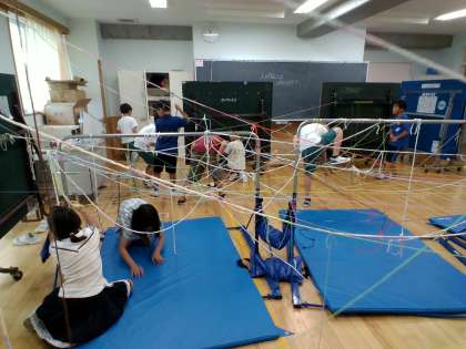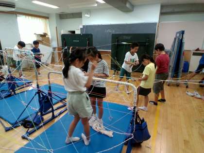 図画工作科「ひもでつないで」の学習では、みどりのルームいっぱいにひもをつないで部屋を変身させています。