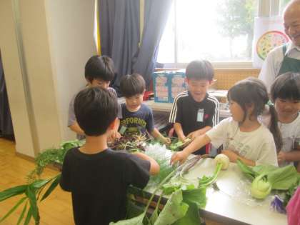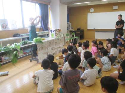 クイズをしたり、野菜や果物に触ったりしながら、食べ物のよさについて理解を深めました。