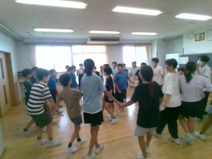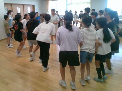 お楽しみ会では、一人の動きをみんなで真似をして、その一人を見付ける「震源地ゲーム」などをしました。マイム・マイムをしたり、歴史の歌を踊りつきでしたりしました。