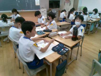 国語科「詩を味わおう」では、題名にこめられた意味について考えました。久しぶりの学習に最初は静かでしたが、時間が経つにつれて、活発な意見が飛び交っていました。