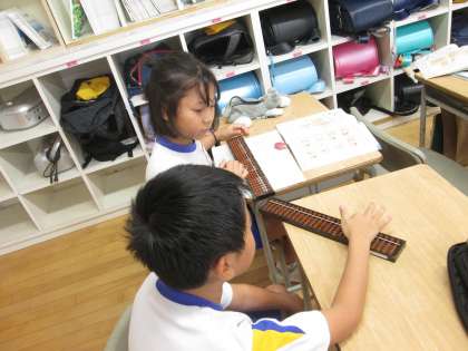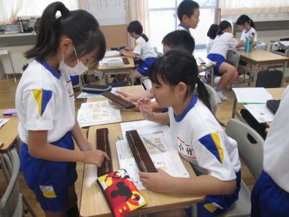 4年生は算数科の学習でそろばんを学習しています。今日は、たし算やひき算をしました。くり上がりやくり下がりについて、教え合う様子が見られました。