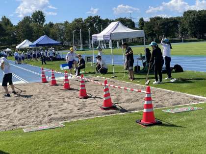 6年生は、陸上競技場で開催されているチャレンジ陸上に参加しています。 暑い中、頑張っています!