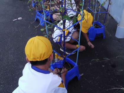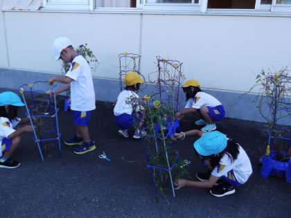 育てていたアサガオの茎やつるが茶色になってきました。そこで、つるを丸めて、リースをつくりました。「丸くするのがむずかしい」「やってたら、楽しくなったよ」「じょうずにできたよ」など、子供たちの会話もはずみます。