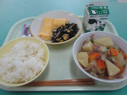 本日の献立は、卵ロール、ひじきとコーンのソテー、ベーコンとじゃがいもの煮物、しらすの佃煮です。