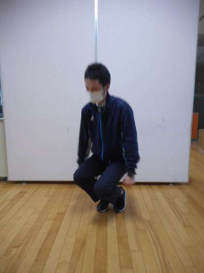 しゃしん2「ありのままたちむかえ」・・・手をふりながら、しゃがむ。