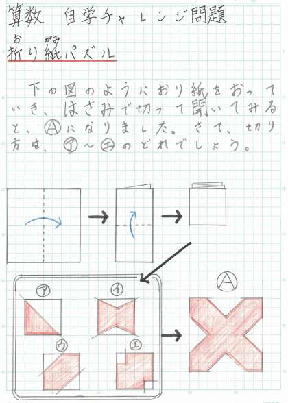 自主学習でとりくめる、算数のチャレンジ問題をしょうかいします。ぜひ、ちょうせんしてみてください。もしとけたら、「自学ノート」に書いて、今度先生に見せてくださいね。お家の方も、いっしょにチャレンジしてみてください。おうちにあるおり紙で、じっさいにおって、切って、たしかめてみるのがおすすめですよ。