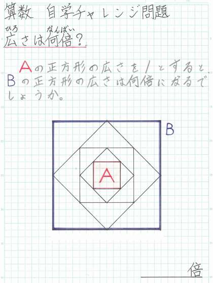 自主学習でとりくめる、算数のチャレンジ問題をしょうかいします。ぜひ、ちょうせんしてみてください。もしとけたら、「自学ノート」に書いて、今度先生に見せてくださいね。お家の方も、いっしょにチャレンジしてみてください。