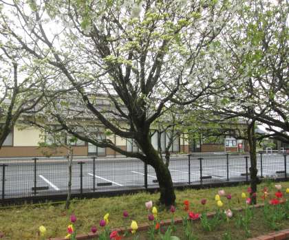学校の花壇を調理員さんが除草してくださいました。遅咲きのサクラも満開です。