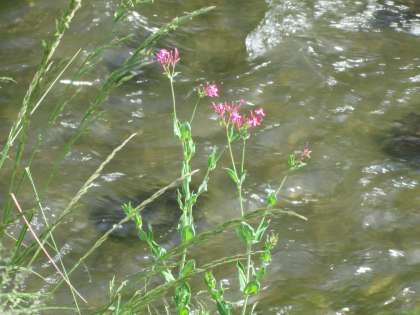 真ん中は、学校裏の用水に架かっている橋のたもとに集まって咲いている赤い花です。