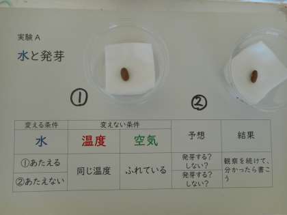 5月18日(月)、種子の発芽と成長の実験を始めましょう。植物の種子が発芽(芽がでること)するには、水、空気、温度のどれが必要でしょうか。条件を変えて実験します。
