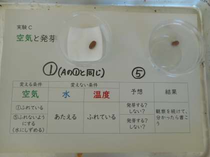 写真は実験A(水と発芽)実験C(空気と発芽)です。それぞれのカップに番号を書いておくと分かりやすいですよ。
