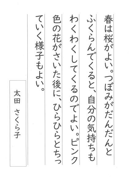 5月20日(水)、今日の国語の課題の作品例を紹介します。枕草子のように、二つの作品には桜とふきのとうのよいと思ったところと自分の気持ちも入れてあります。