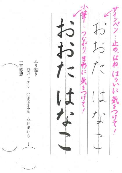 久しぶりに、ひらがなで名前を書く人もいると思います。「点画のつながりと字形」を意識して、丁寧に取り組みましょう。