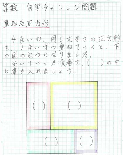 自主学習でとりくめる、算数のチャレンジ問題をしょうかいします。ぜひ、ちょうせんしてみてください。もしとけたら、「自学ノート」に書いて、今度先生に見せてくださいね。お家の方も、いっしょにチャレンジしてみてください。