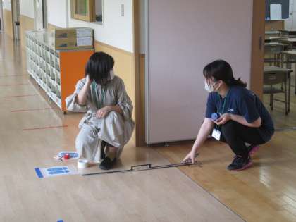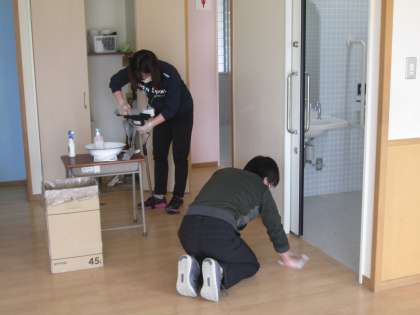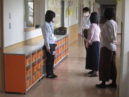 来週の分散登校に向けて、準備を進めています。清掃、消毒作業。洗面所等、混雑が想定される場所の目印付け等を行っています。