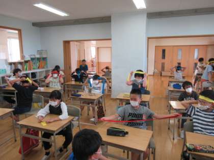 また、体育で使うハチマキを配りました。これまで帽子だったので、苦戦をしていました。さぁ、今日の宿題の10秒チャレンジはできたでしょうか。