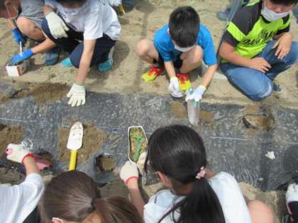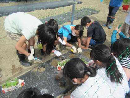 6月1日(月)、今日から全員登校が始まり、4月当初に牛乳パックに植えたヘチマの本葉が2〜3枚に生長したので、学校の畑に植え替えをしました。これから、根がしっかり畑に植え付くまで、毎日水やりを交代でしたいと思います。生長が楽しみな様子の4年生でした。