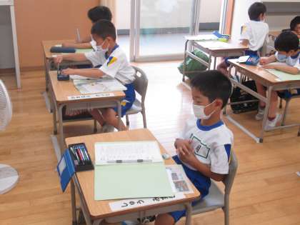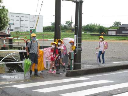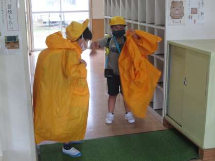 12日(金)は、雨上がりの朝となりました。1年生にとっては、小学校に入って初めての本格的な雨の朝であり、合羽を玄関で脱ぐことも大切な学習の場となっていました。