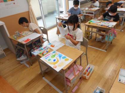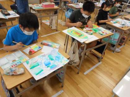 6月12日(金)、図工の時間に水彩を使って絵を描きました。水を調節してぼかしたり、偶然できたにじみやかすれなどを楽しんだりしながらそれぞれの心のもようを描きました。