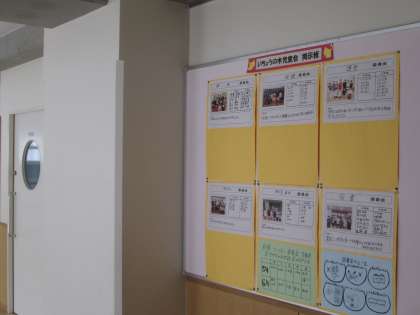 19日(金)は、カラフルな傘が並ぶ朝です。先日に続き、1年生が頑張って合羽を脱いでいました。少し上手になったかな。右の写真は、保健室横の委員会の紹介コーナーです。