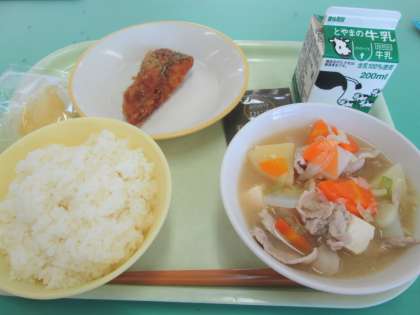 本日の献立はごはん、牛乳、あじの竜田揚げ、豚汁、冷凍りんご、しそひじきふりかけです。
