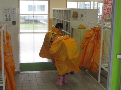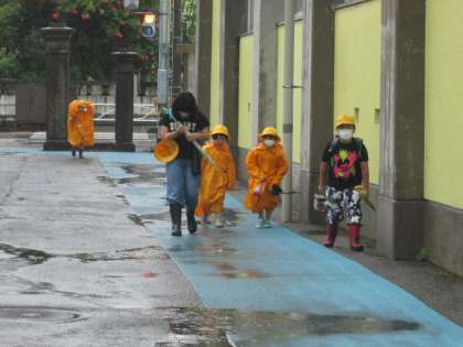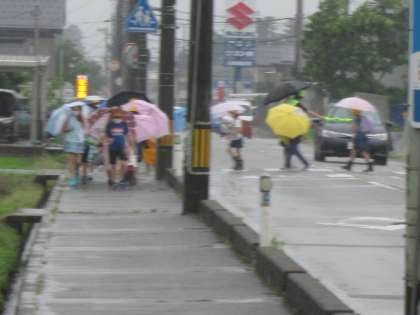 26日(金)は、激しい雨風の朝です。傘が飛ばされそうになっている子、合羽でも濡れる子等、大変でしたが、「べちょべちょだあ〜」と笑って学校に入ったり一生懸命に合羽を脱いだりする姿が、本当に頼もしいです。また今日は「安全の日」です。生活表で集団登校を振り返る、避難訓練を実施する、防犯ブザーを鳴らしてみるなどを予定しています。