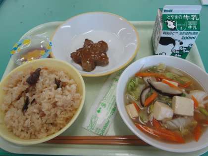 本日の献立は、五目ご飯、星形ハンバーグ、豆腐スープ、七夕ゼリーです。来週に近付いた七夕をイメージしたメニューですね。