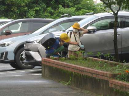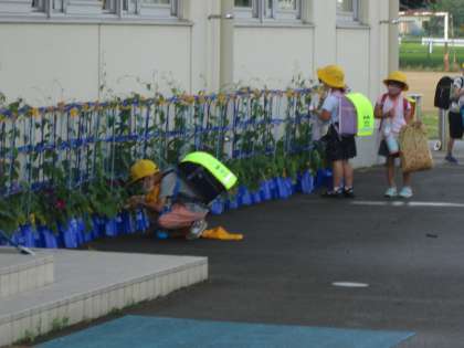 7月1日(水)は、蒸し暑い朝です(交通指導員の方に感謝)。このまま雨が降らなければ、「いちょうタイム」をグラウンドや遊具で思い切り楽しめそうですが。3年生の花壇、2年生の野菜、1年生のアサガオは、こんな日は水やりしないことを学ぶ良い機会でとなりました。