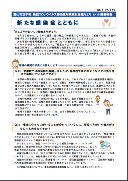 新型コロナウイルス感染症対策検討会議だよりVL.4 公開日 2020/07/03 更新日 2020/07/03 学校の様子 本日、プリントでも配布しますが、本ホームページ右の「配付文書」より、「新型コロナウイルス感染症対策検討会議だよりvol.4」の閲覧が可能です。ぜひ、ご覧ください。