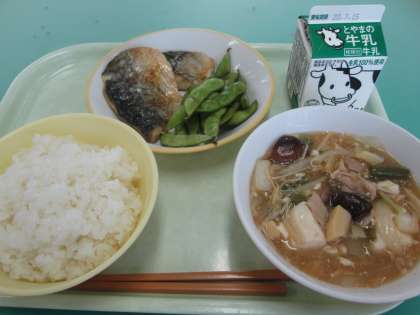 本日の献立は、さばの塩焼き、枝豆、豆腐と野菜のうま煮です。