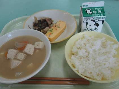 本日の献立は、ごはん、牛乳、千草焼き、もずくのチャプチェ、ごまけんちん です。