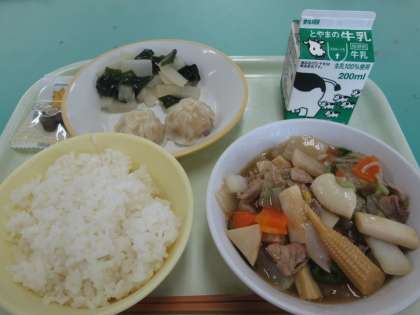 八宝菜には豚肉、いか、たけのこ、ヤングコーンなど、なんと11種類もの食材が入っています。子供たちは何種類見つけられたでしょうか?具だくさんで食べていて楽しいメニューでした。
