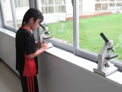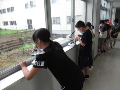 理科「植物のからだのはたらき」の学習で、植物は根から吸った水を出していることが分かりました。その出口を探るため、葉の表面を顕微鏡で観察しました。