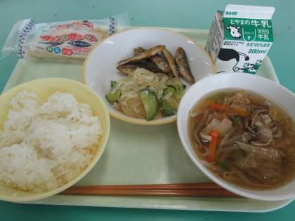 本日の献立は、小あじの唐揚げ、バンサンスー、キムチスープ、ブルーベリークレープです。