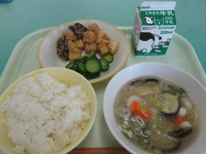 本日の献立は、高野豆腐とレバーのごまからめ、きゅうりもみ、なすのみそ汁です。