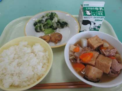 本日の献立は、厚揚げの中華煮込み、ほたての照焼き、梅肉和えです。