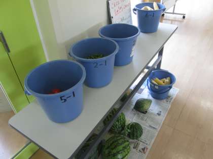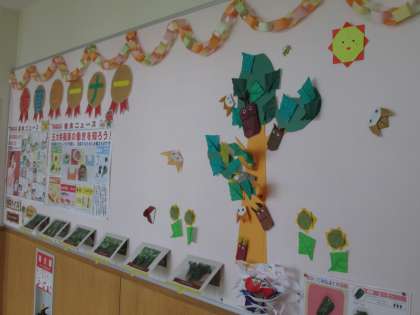 31日(金)、7月最後の朝です。今日は「安全の日」なので、朝の「太田の木」カードで集団登校も振り返ります。昨日のHPで紹介した2年生の学校農園での収穫は、写真の通りです。もう1枚の写真は、家庭科室横(現在、音楽の授業で使用)の食育コーナーです。これは、いつもは栄養職員が掲示していますが、今月は特別「調理員さん手作り」の夏の飾りです。子供たちがなかなか通らない場所なのが残念ですが、近くを通った際に見て欲しいです。