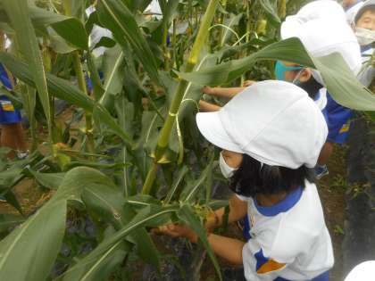 うねには、子供たちの背丈よりもずいぶん大きく伸びたトウモロコシがたくさん並んでいます。実の根元をしっかりと持って、下の方向にもぐことを教えてもらいました。