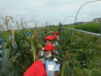 7月30日(木)1時間目、生活科の学習で、地域の方に育てていただいたトウモロコシの収穫を、体験させてもらいました。