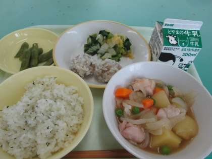 本日の献立は、菜めし、鶏肉とじゃがいもの煮物、珍珠丸子、チンゲンサイのおひたしです。枝豆は、学校農園で収穫したものです。
