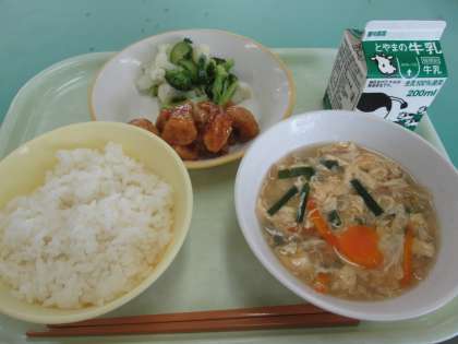 本日の献立は、鶏肉のマーマレードソースかけ、花野菜サラダ、かきたまスープです。